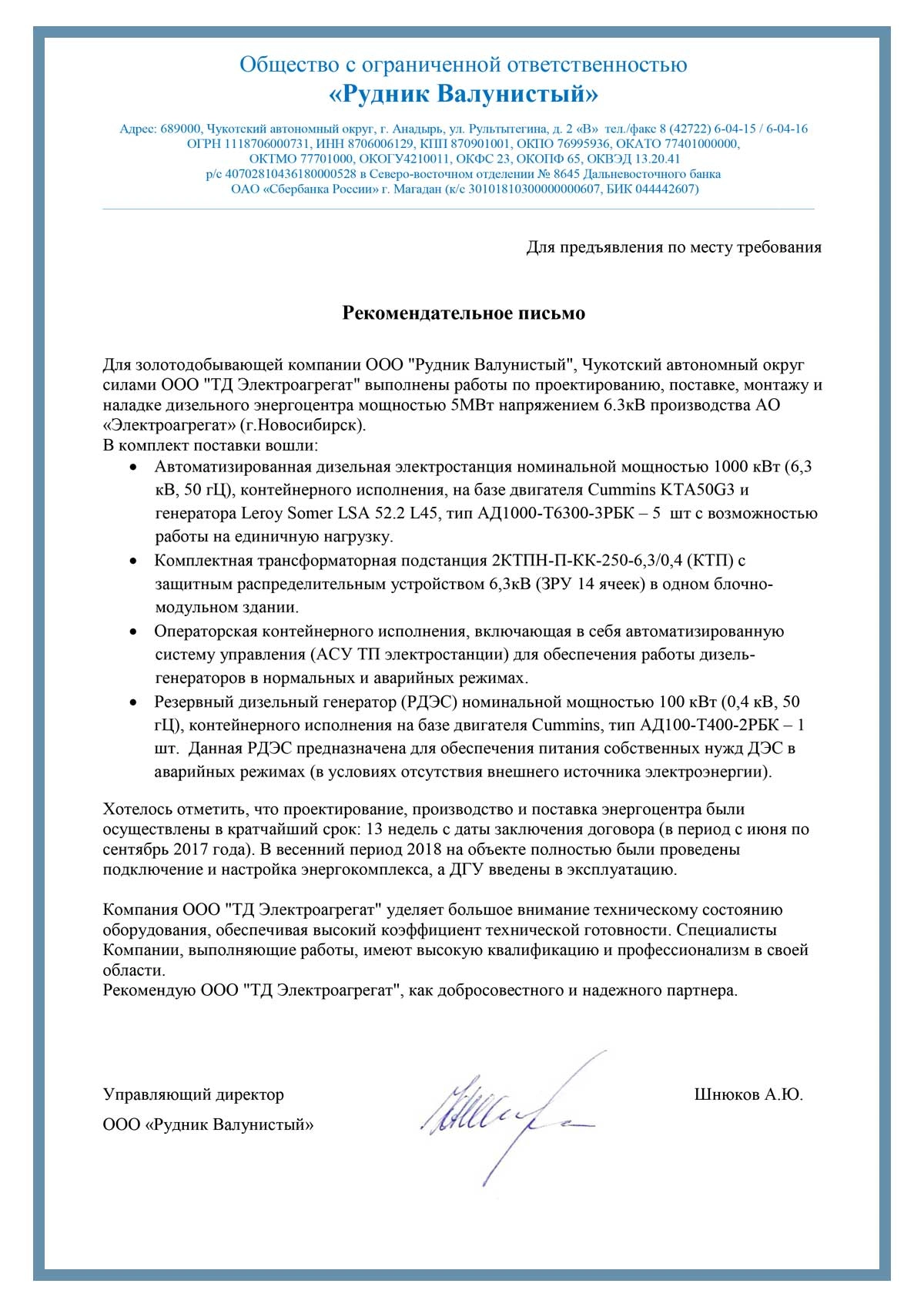 Отзыв контрагентов о компании ООО «ТД Электроагрегат» и  исполненном проекте для ООО «Рудник Валунистый»